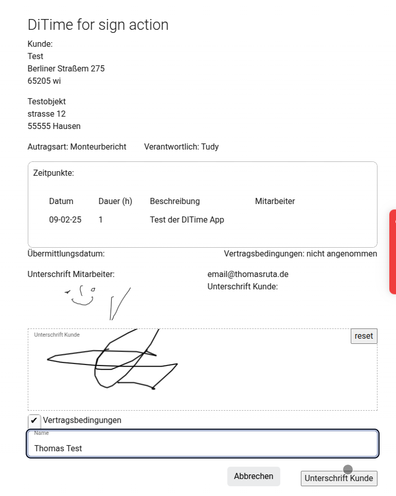 Mit der Unterschrift des Kunden stimmt er den Vertragsbedigungen die vereinbart sind zu und Kann seinen Namen für die Unterschrift anpassen.
